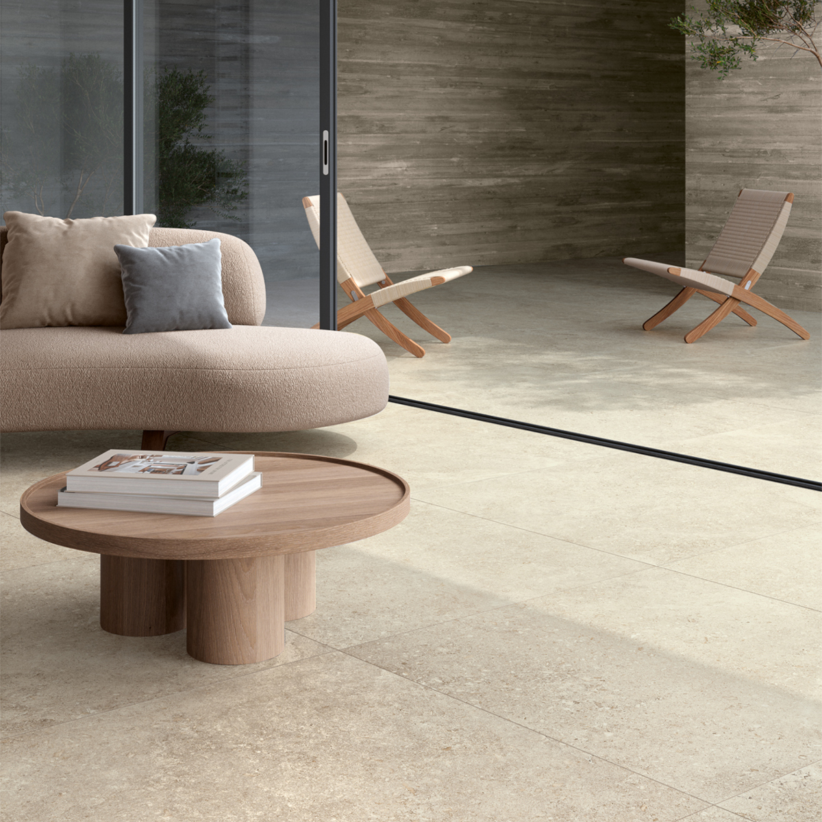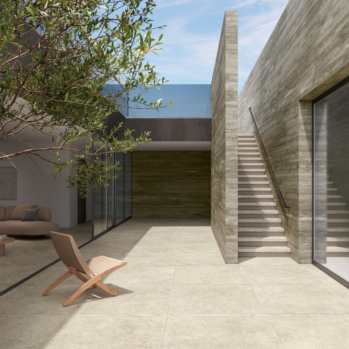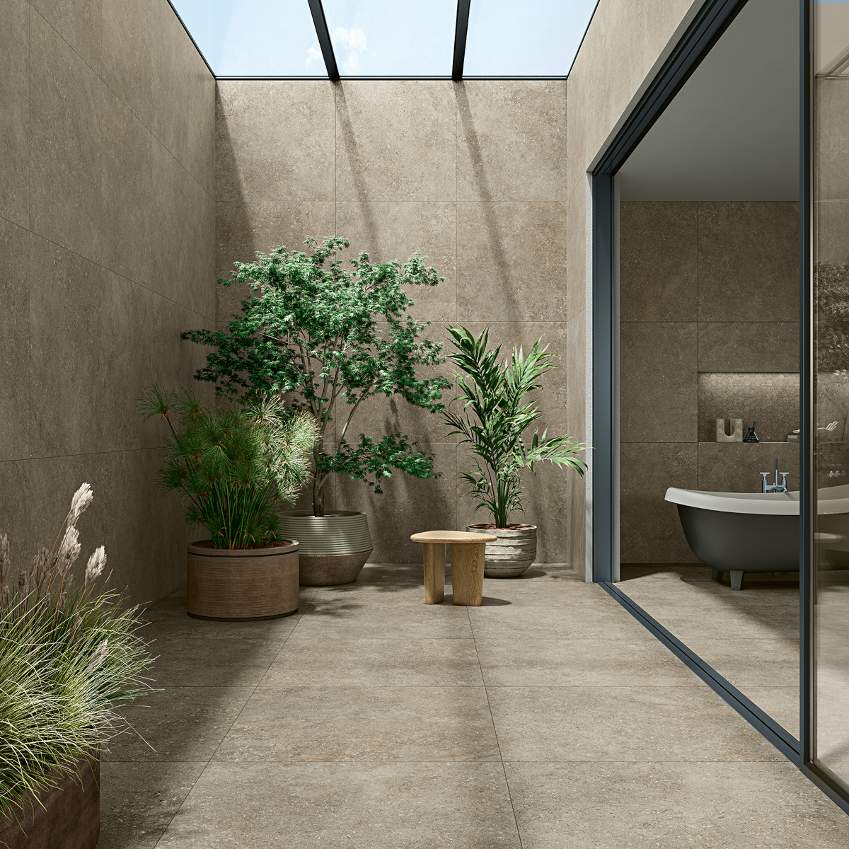 - Gresová dlažba s imitáciou kameňa, s rektifikovanými hranami a matným povrchom.