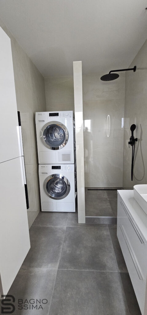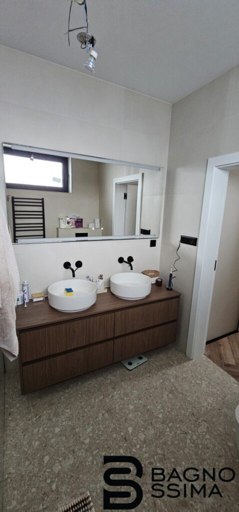 Realizácia apartmánu v slnečnom Chorvátsku. Obklad s drevodekorom Taco Oxford od Porcelanosy. Dôraz na prírodné ladenie priestoru so zlatými prvkami sme ozdobili voľne stojacim umývadlom a závesným WC v mramorovom dekore. Čerešničkou v dovolenkovej destinácií sú zlaté batérie so série Exclusive od výrobcu Tres.